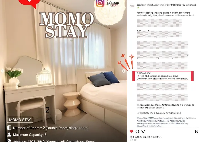 Апартаменты Momostay Seoul расположены в районе Gwanak-Gu, менее чем в 2 км от Теологического университета и семинария Кукче. На территории есть парная, солярий и сауна. Проживая в апартаментах, гости могут насладиться обертыванием, педикюром и маникюром, а также позаниматься спортом используя занятия йогой.